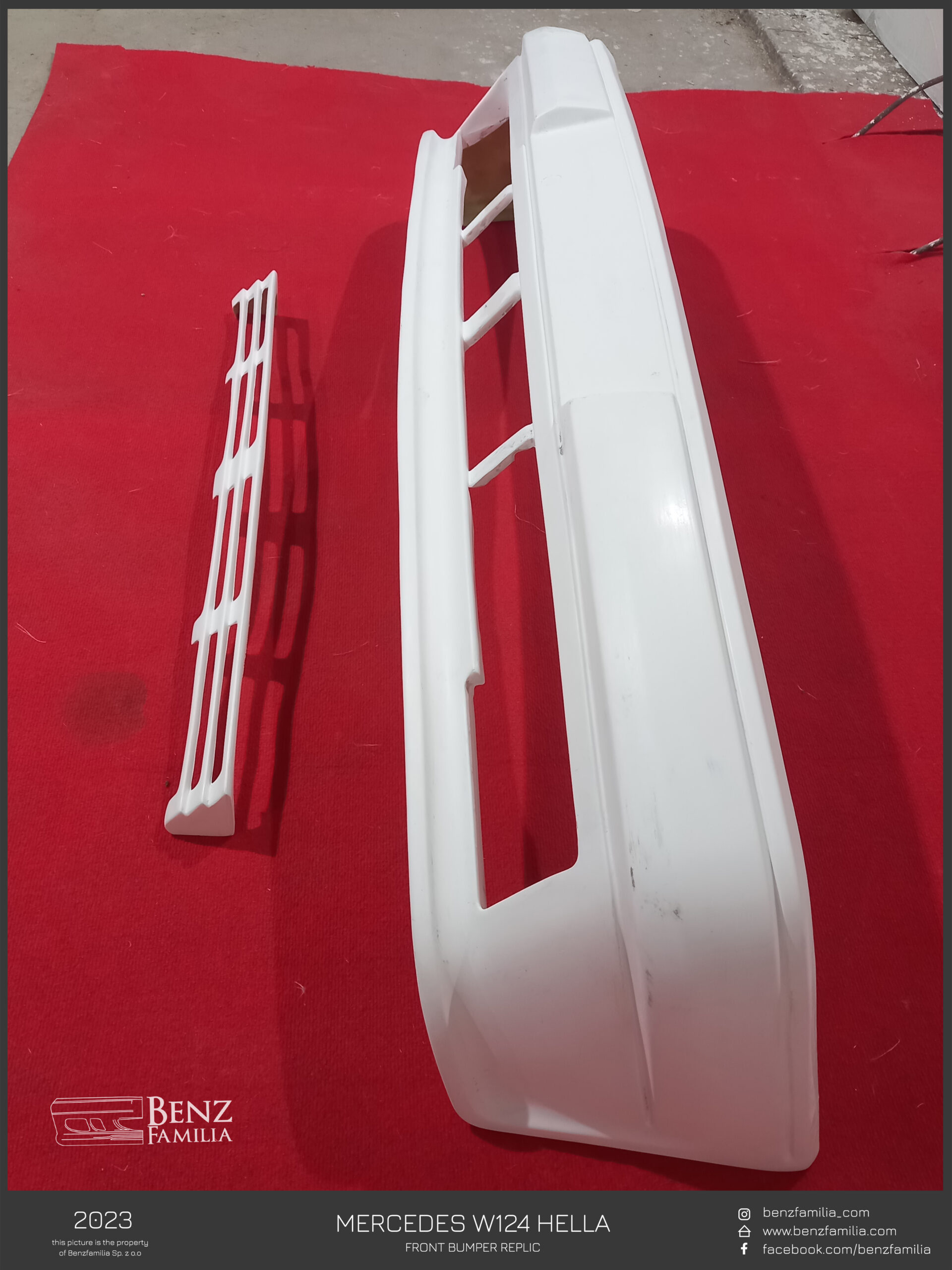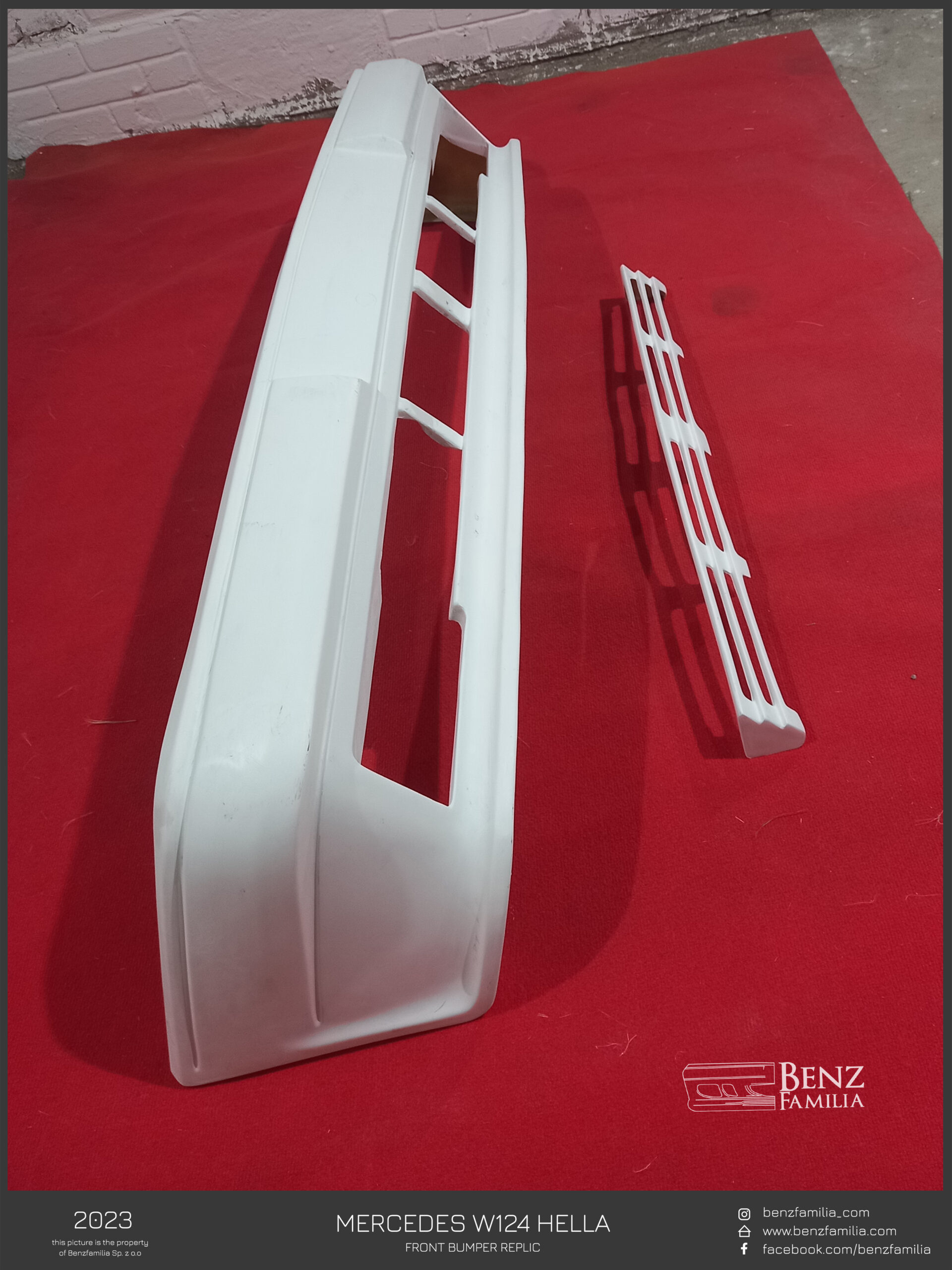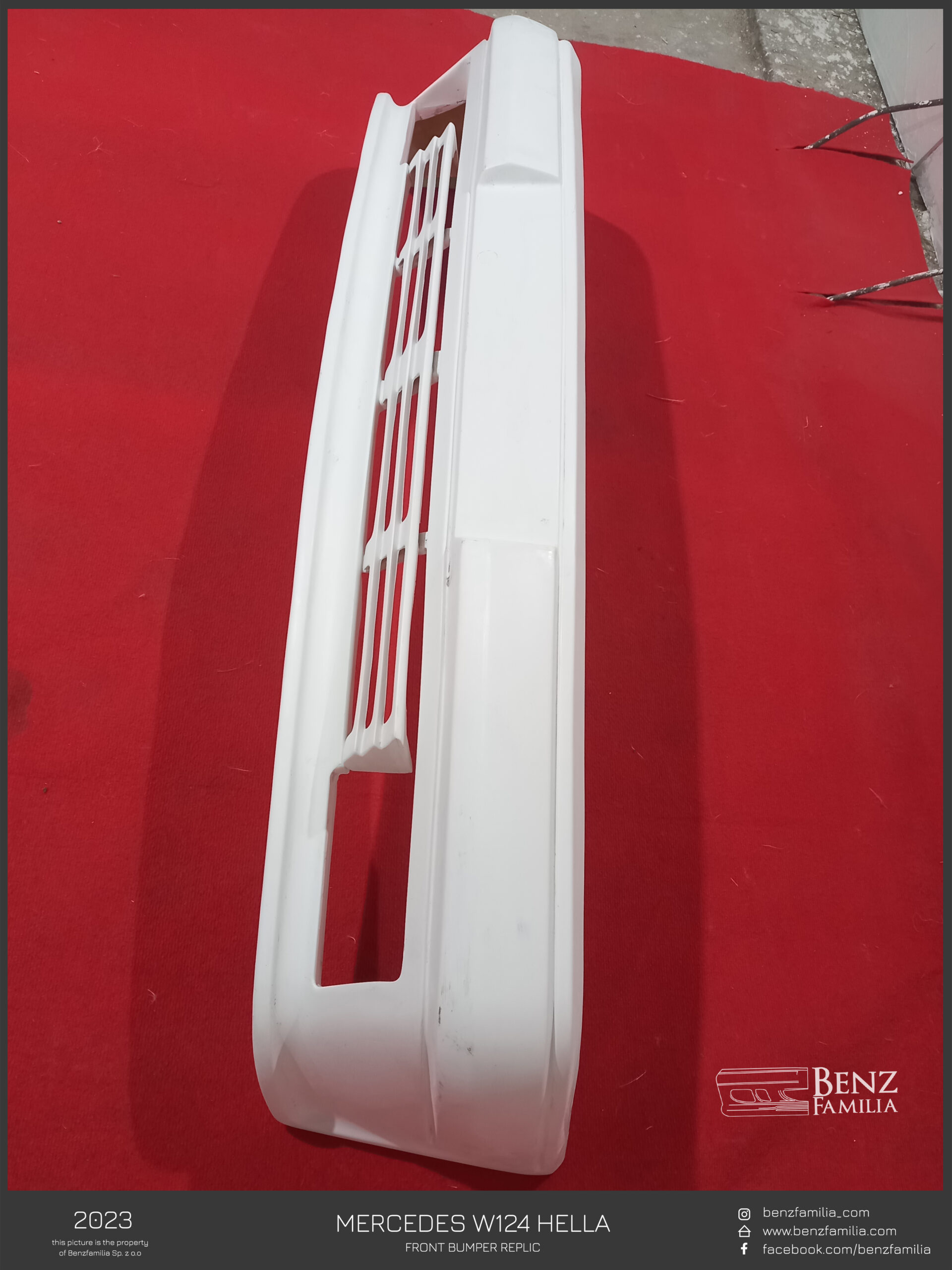 Replika przedniego zderzaka firmy Hella do Mercedesa W124. Element pasujący do każdej wersji nadwoziowej tego modelu. Zderzak wykonany jest z włókna szklanego.