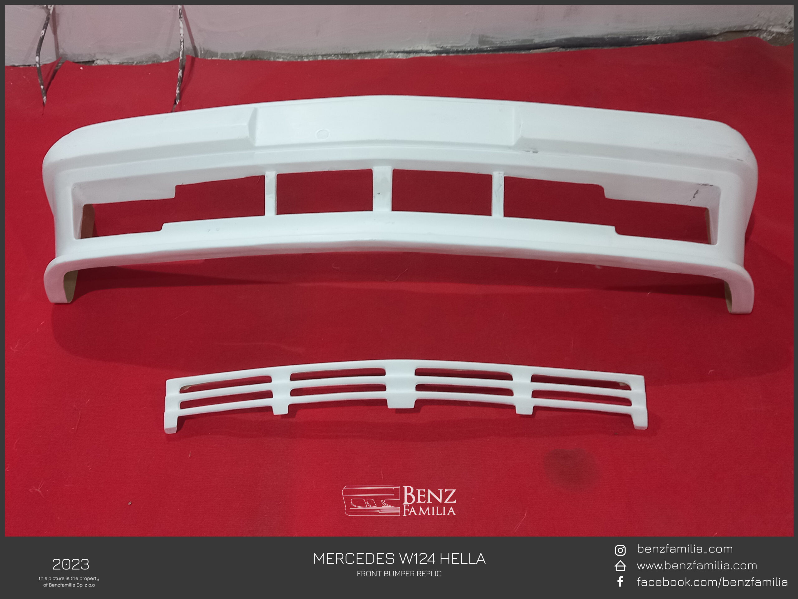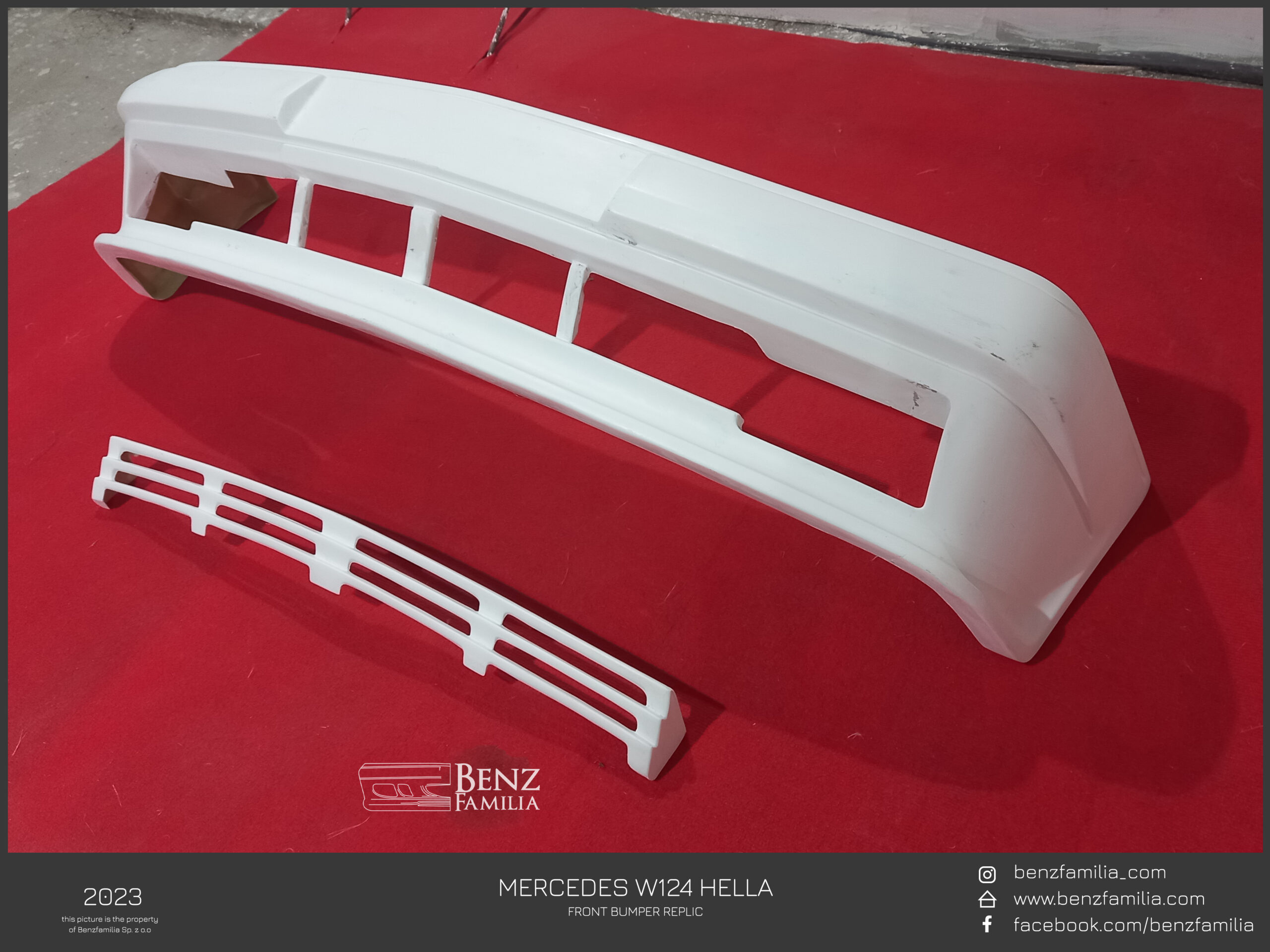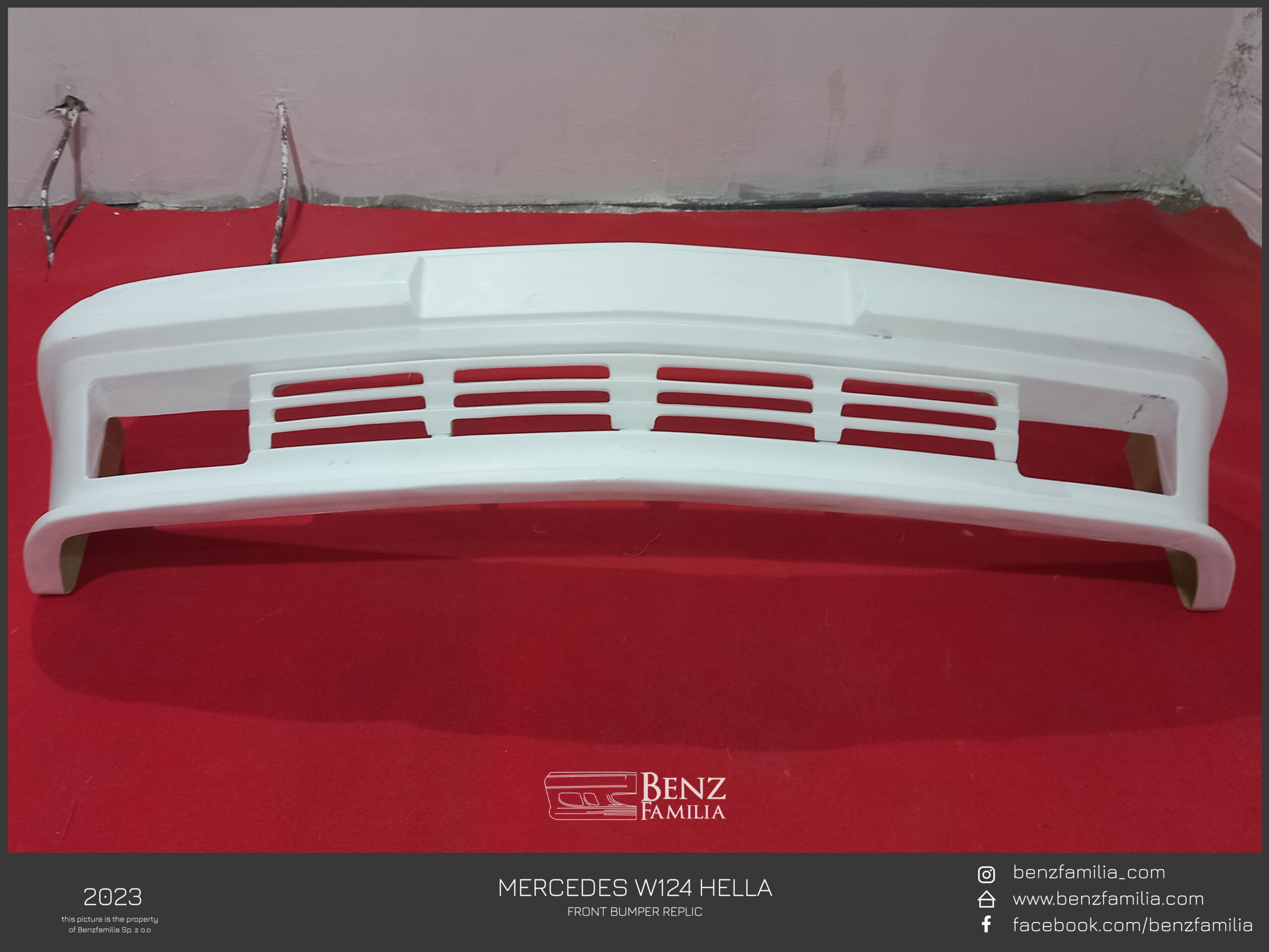 Replika przedniego zderzaka firmy Hella do Mercedesa W124. Element pasujący do każdej wersji nadwoziowej tego modelu. Zderzak wykonany jest z włókna szklanego.