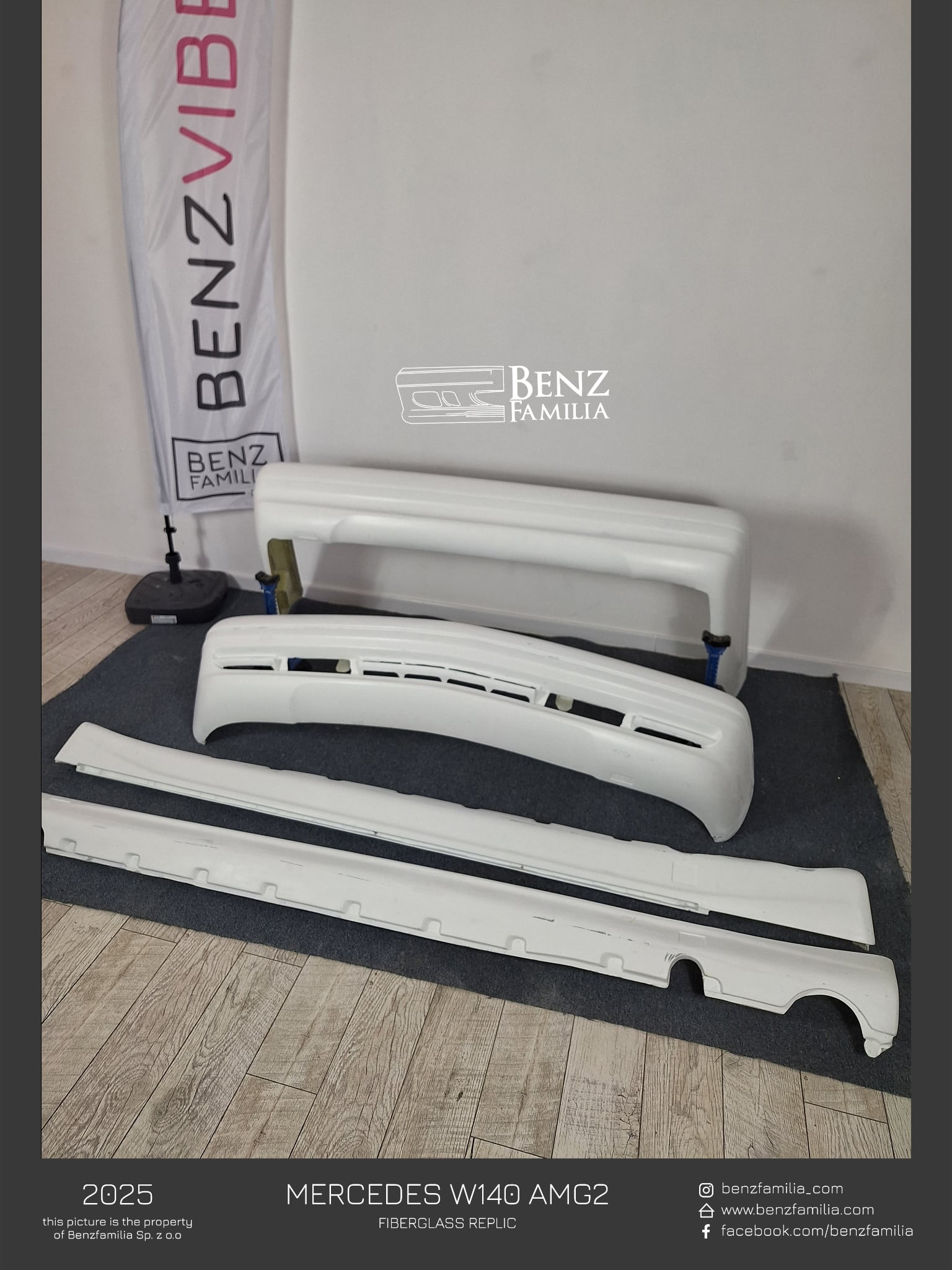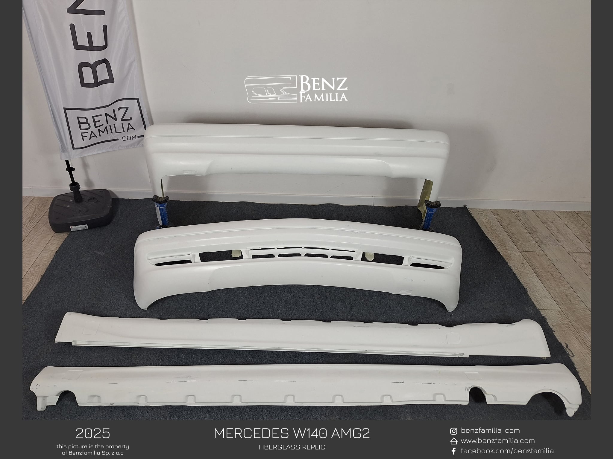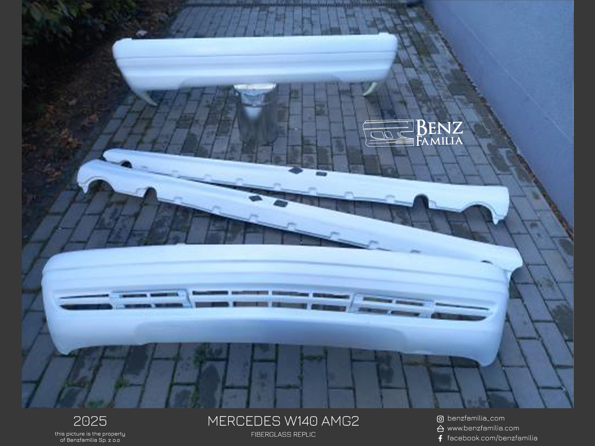 W skład zestawu wchodzi przedni zderzak wraz z dwoma zaślepkami i podkładką pod tablice (EU bądź USA), para progów oraz tylny zderzak
